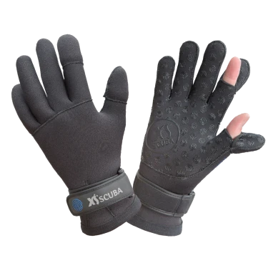 A unique concept in dive gloves which allows the diver to temporarily expose his thumb and forefinger to engage push buttons on wrist top computers, watches, GoProsâ„¢ and cameras.