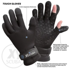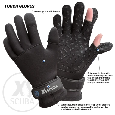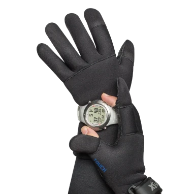 – Retractable fingertip and thumb caps expose the finger and thumb to operate your dive computer or camera