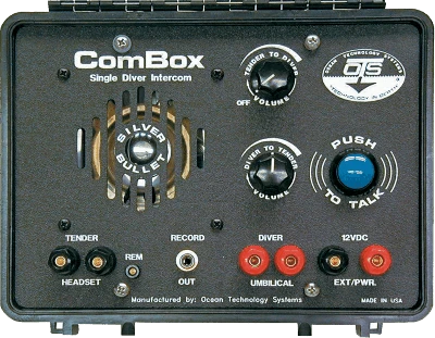 Simplest way to communicate to one diver through a hardwire connection Surface unit is self contained and compact size 20 watts of power for clear communication Easy to use controls: Push to talk and adjustable volume External connection allows recording communications Uses 16 AA Alkaline Batteries (6 hours continuous use) Optional rechargable batteries and charger Connection to run from an external 12 volt battery Size: 9″ x 7.8″ x 3.4″