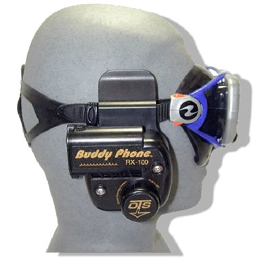 Receive Only System Attaches to existing mask strap and positions over the ear Squelch unit to descrease bubble and marine biological noise 130 Feet