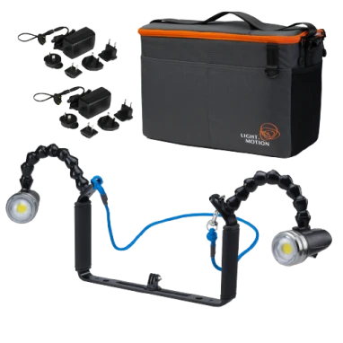 This kit includes two Sola Video Pro 3800 lights, the ultimate light for wide-angle photography.  The Sola Video Pro casts a diffuse flood beam with super-smooth, super-even coverage with an almost imperceptible fall-off that is perfect for wide-angle coverage. The compact, lightweight body is easy to travel and dive with. The top-mounted sliding push-switch provides fast and easy access to three power modes and an emergency strobe. It features both a mechanical and a digital lock to prevent accidental activation in transit. Three colored LEDs indicate battery status and the currently selected power mode. The light outputs up to 3,800 lumens in a wide 110-degree beam. Its wide beam angle disperses the light over a much wider area. Coverage from one Sola is plenty wide for medium-sized cameras, but a pair of lights may be required for ideal exposure.