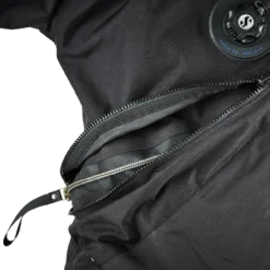 Front diagonal BDM metal dry zipper keeps water out and makes self-donning easy.