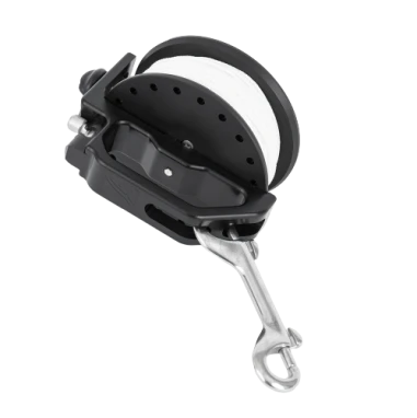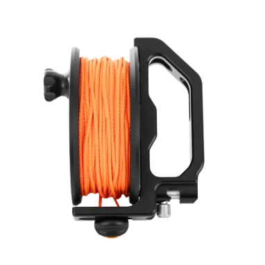 By using an all-machined spool design rather than injection molded plastic, tight tolerances can be used at the spool-to-frame interface, making the Slide Lock 2 incredibly smooth to operate and highly resistant to jamming. If the spool does need to be removed, it is a simple procedure using only a 3/16-inch hex wrench to remove the axle. There are no small parts, washers, or clips to lose. A small “fuel gauge” slot on the front panel of the spool allows the diver to see how much line remains at a glance. The fully knurled inner spindle and line-lock holes on the spool side plate completely prevent any slipping of the line on the spool when reeling up.