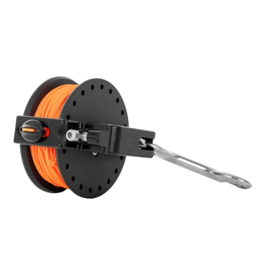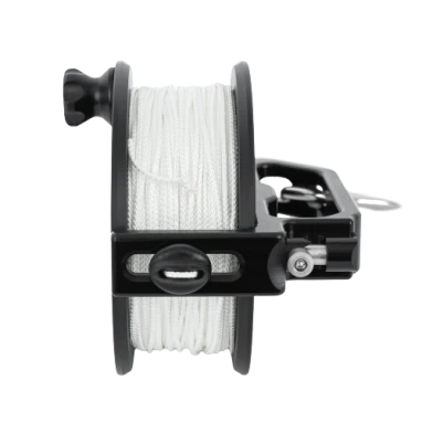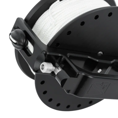 By using an all-machined spool design rather than injection molded plastic, tight tolerances can be used at the spool-to-frame interface, making the Slide Lock 2 incredibly smooth to operate and highly resistant to jamming. If the spool does need to be removed, it is a simple procedure using only a 3/16-inch hex wrench to remove the axle. There are no small parts, washers, or clips to lose. A small “fuel gauge” slot on the front panel of the spool allows the diver to see how much line remains at a glance. The fully knurled inner spindle and line-lock holes on the spool side plate completely prevent any slipping of the line on the spool when reeling up.