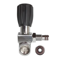 – The photo shown is an example of a XS Scuba DIN outlet left hand modular valve (VX300L-30N) paired with a Thermo PRO outlet left hand H adapter (VH200L-N)